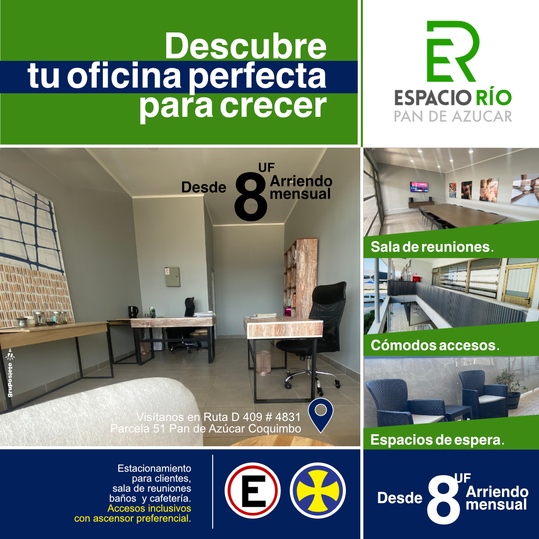 Ubicadas en una zona estratégica de la ciudad de Coquimbo, las oficinas en Espacio Río Pan de Azúcar ofrecen un entorno de trabajo ideal para empresas que buscan eficiencia, comodidad y conectividad.